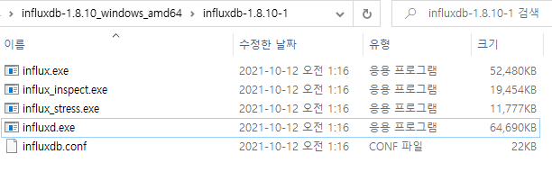 influxd.exe를 실행하면 influx 서버가 실행되는 것이다. 필요에 따라 이 프로그램을 실행/종료하면 된다.