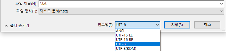 그래서 메모장에 옮기고 다른 이름으로 저장할 때 UTF-8을 선택하여 해결했다.