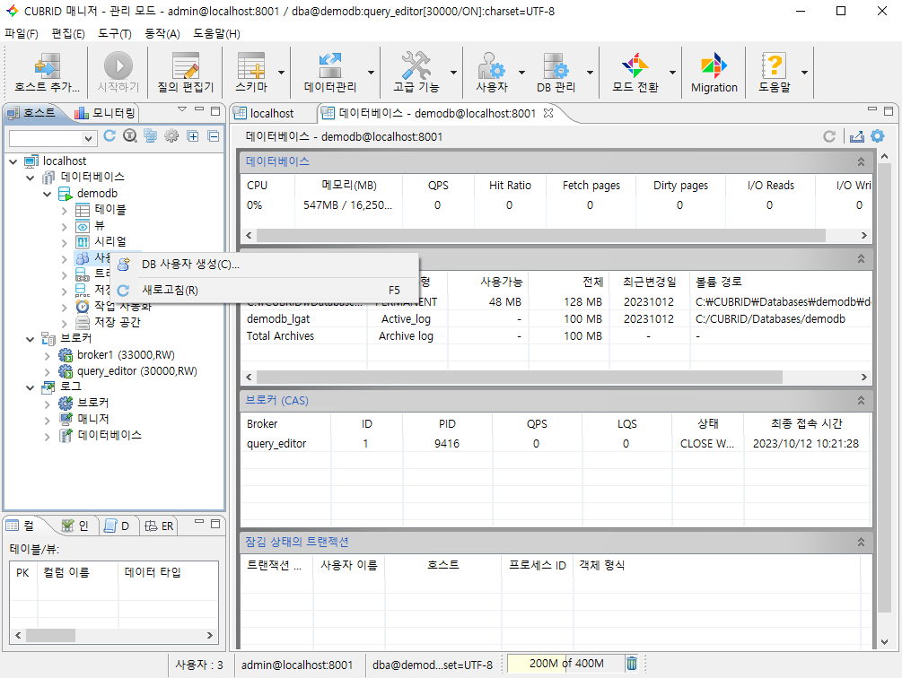 demodb의 사용자 탭을 오른쪽 클릭하면 DB 사용자 생성이 있다.
