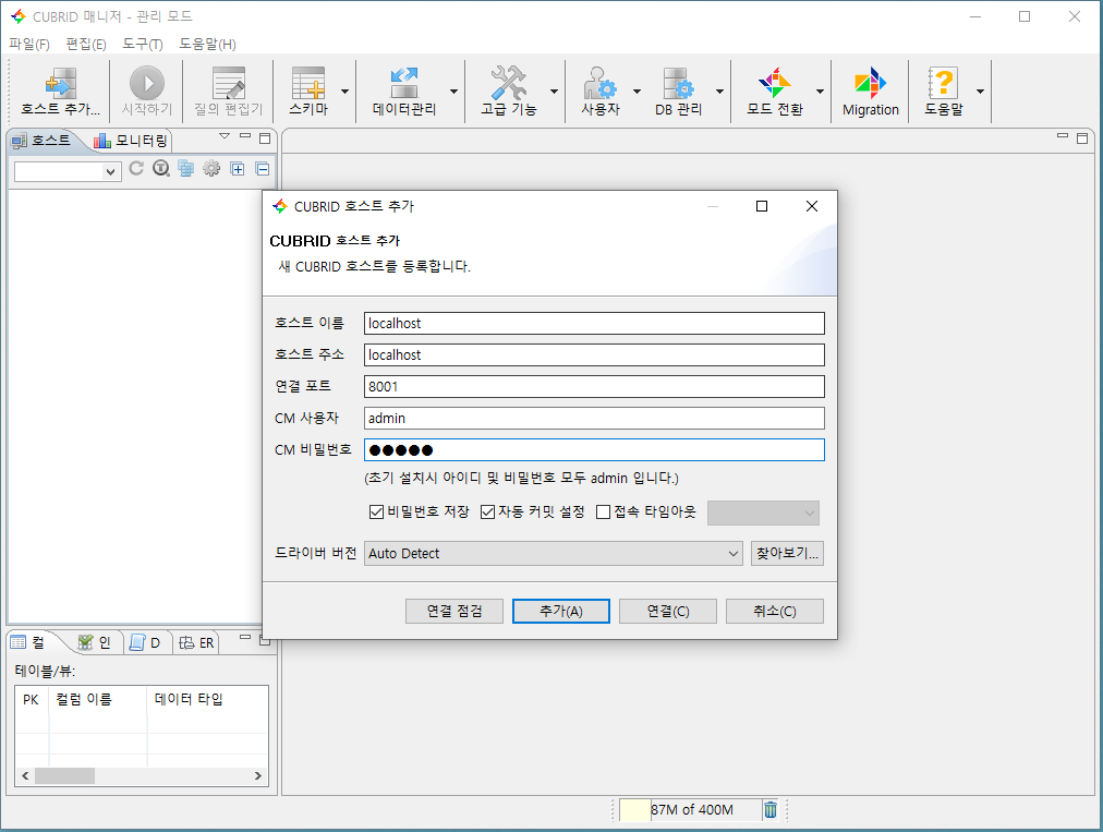 호스트 주소와 연결 포트, CM 사용자 란은 자동으로 채워져 있으니 호스트 이름과 CM 비밀번호만 입력해주면 된다.