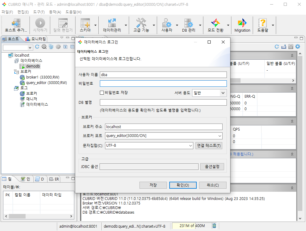 왼쪽 호스트 탭에 추가된 localhost의 demodb 데이터베이스를 더블 클릭하여 시작하면 로그인 창이 뜬다.