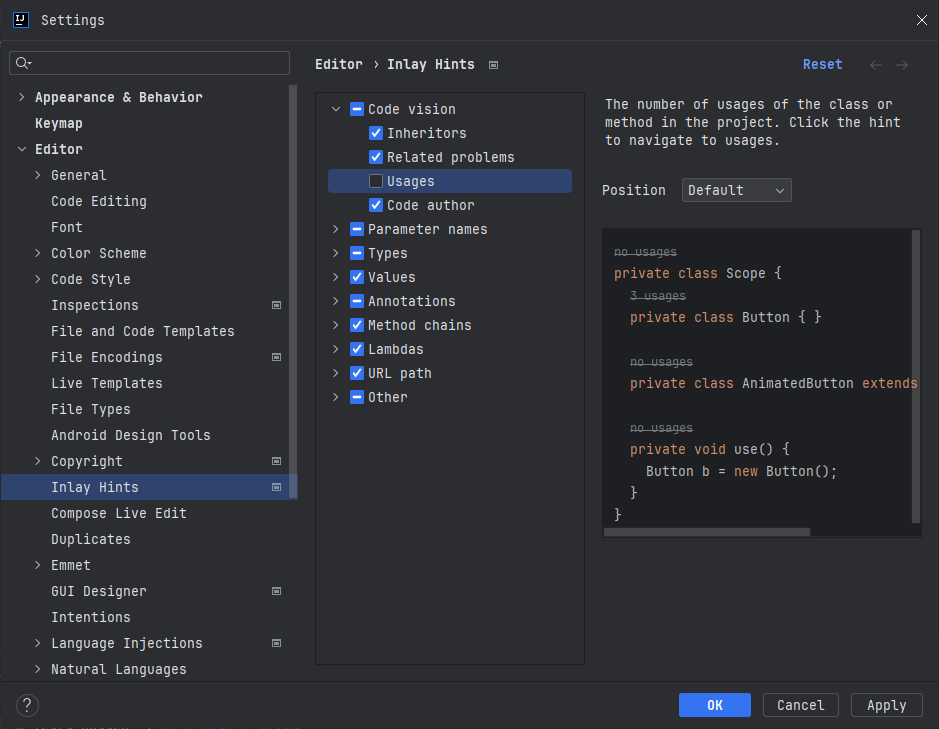 코드 작성 시 클래스 혹은 메소드 상단에 보이는 no usages가 상당히 거슬린다.